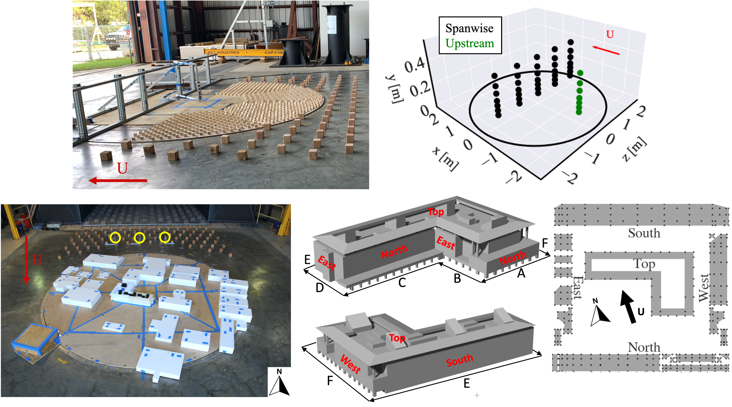 We investigated the pressure loads on a realistic low-rise building configuration within an urban area to study wind-induced pressure loads due to the surrounding buildings. The test case is the Y2E2 building in Stanford Engineering Quad. Experiments were performed at two wind tunnels; the NHERI Wall of Wind (WOW) wind tunnel at the Florida International University facility, and the NHERI terraformer Boundary Layer Wind Tunnel at the University of Florida (UF). The dataset is available for download below.