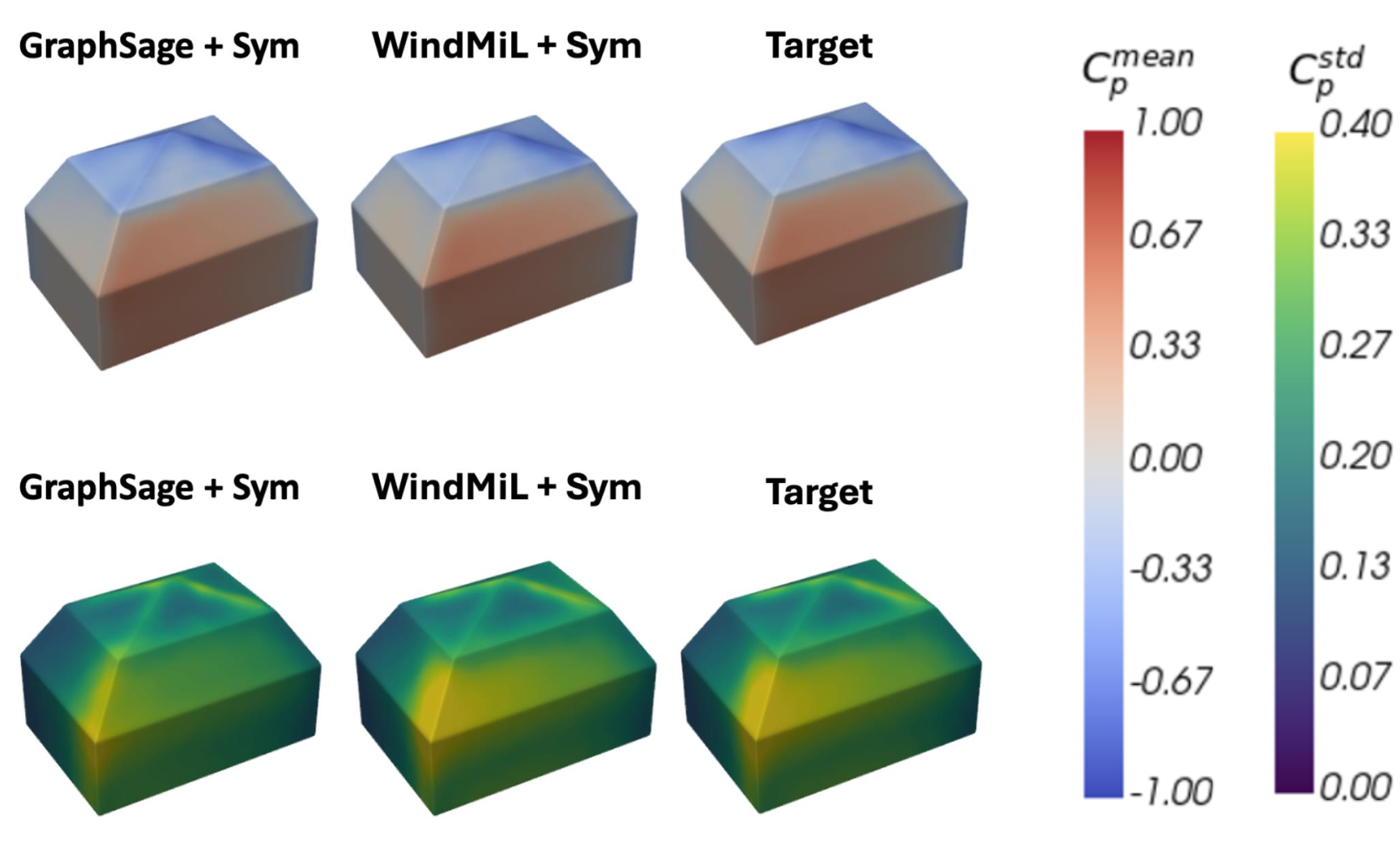 This research introduces WindMiL, a symmetry-aware graph neural network surrogate for predicting wind pressures on low-rise buildings. We build a systematic LES dataset (462 cases) by interpolating roof geometries with signed-distance function, then train a reflection-equivariant GNN that guarantees consistent predictions on mirrored building geometries. WindMiL accurately estimates the surface pressure coefficients and remains robust in extrapolation, while running in seconds rather than hours required for LES workflows.